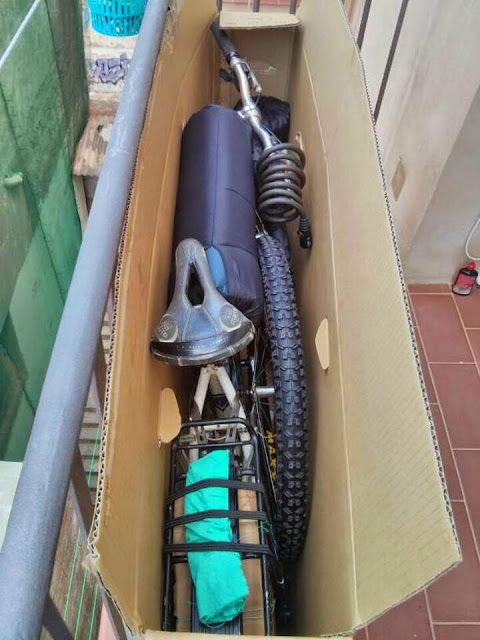 Empaquetamos de nuevo nuestras bicis en las mismas cajas en que vinieron. Estaban guardadas en el jardín de casa Olga envueltas en un plástico de pintor para que no se mojaran, han pasado dos semanas al intemperie, pero están bien.